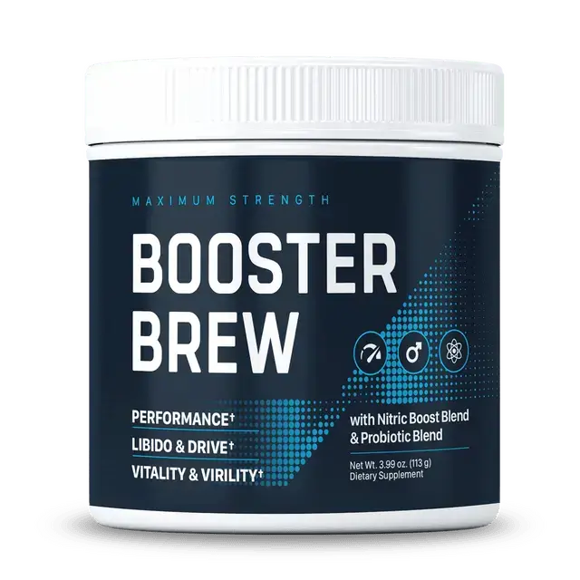 A clean, high-resolution image showing the Booster Brew™ supplement container placed on a neutral background. The packaging highlights the product name clearly, reinforcing its positioning as a natural men’s health supplement designed to support stamina, testosterone balance, libido, and daily energy for men